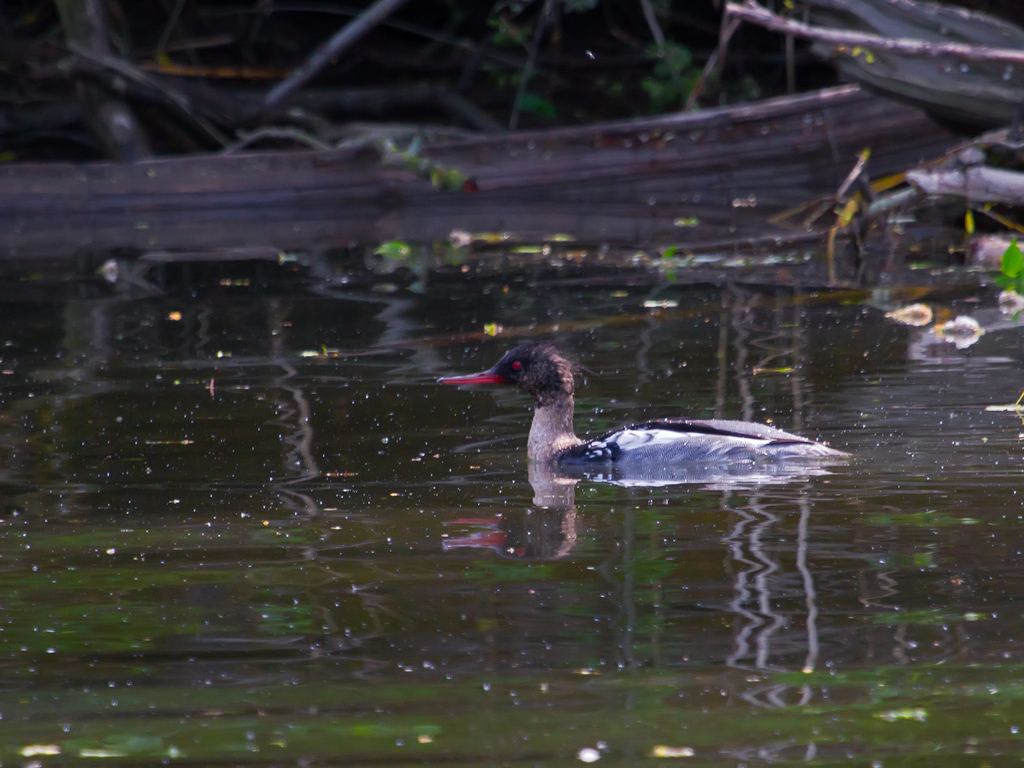 På veien tilbake stoppet jeg litt opp ved elva og mellom greiene så jeg en Siland ligge stille. Den er vanskelig å komme innpå ,men den så meg ikke, i allefall ikke med engang :) Den liker fisk og er alltid klar for å dykke! Litt bustete på hodet og røde øyne! Kan minne noe om Laksanda,men Laksanda har litt lengre nebb med en huk på tuppen. Tror i alle fall den er lenger.